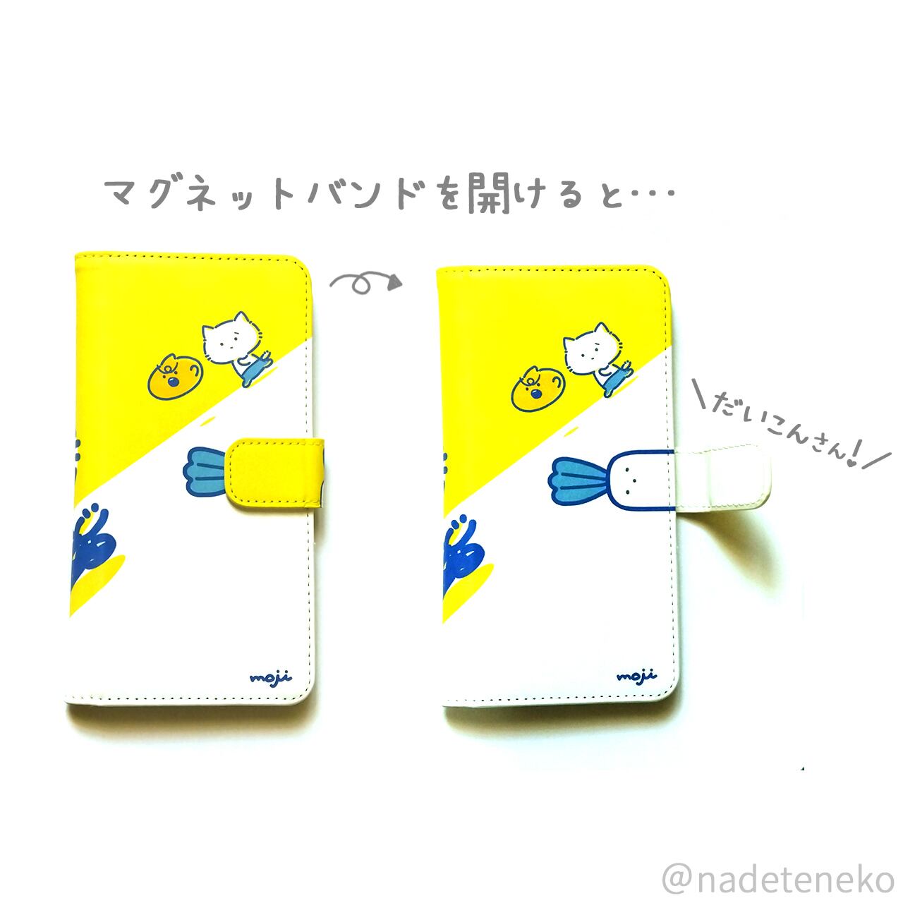 ねこと仲間たちが楽しく追いかけっこしているイラストの手帳型スマホケースです。ベルトを開くと友達の白大根が顔を出す面白味あるデザインです。