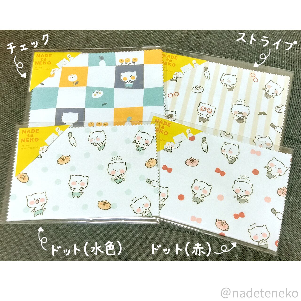 ねこたちのイラストのめがねふきです。ポーチに入れて持ち歩けるコンパクトサイズで、いつでもどこでも手軽に使えます。汚れや指紋をキレイに取り除き、いつもクリアな視界を保ってくれます。